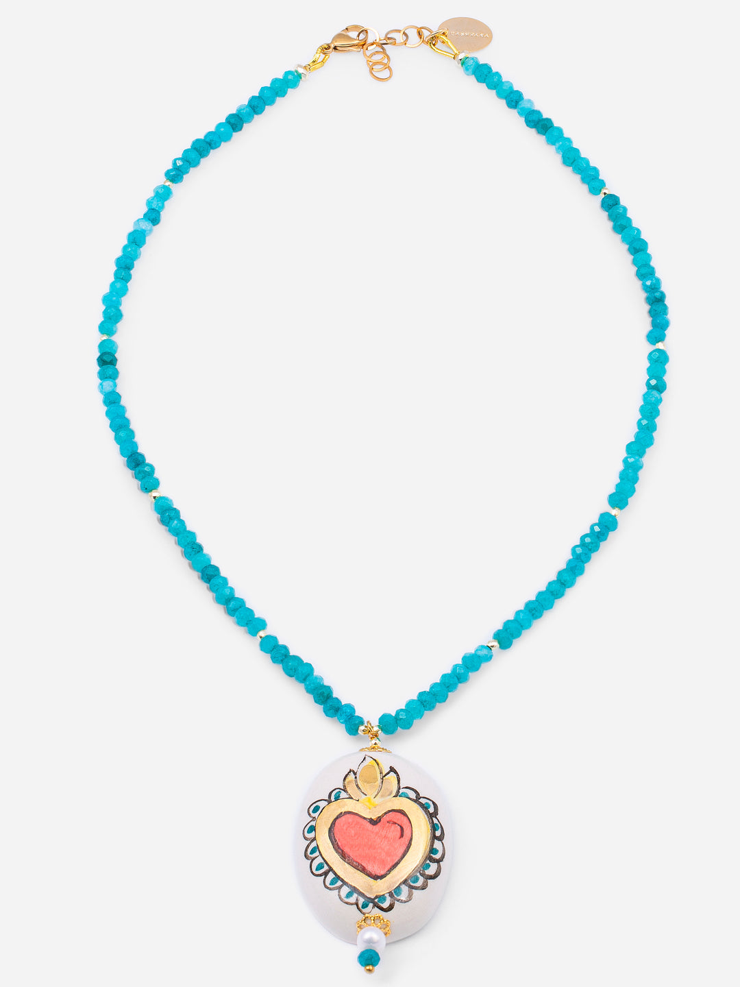 The Cuore Bianco necklace combines the power of symbolism with the refinement of a handcrafted piece. Made of carved turquoise blue beads and a lightweight ceramic pendant shaped like a flaming red heart on a white background, this piece reinterprets the iconic "sacred heart" with a contemporary language. Its vibrant color palette and bold style make it perfect for elevating any outfit, any time of the year.