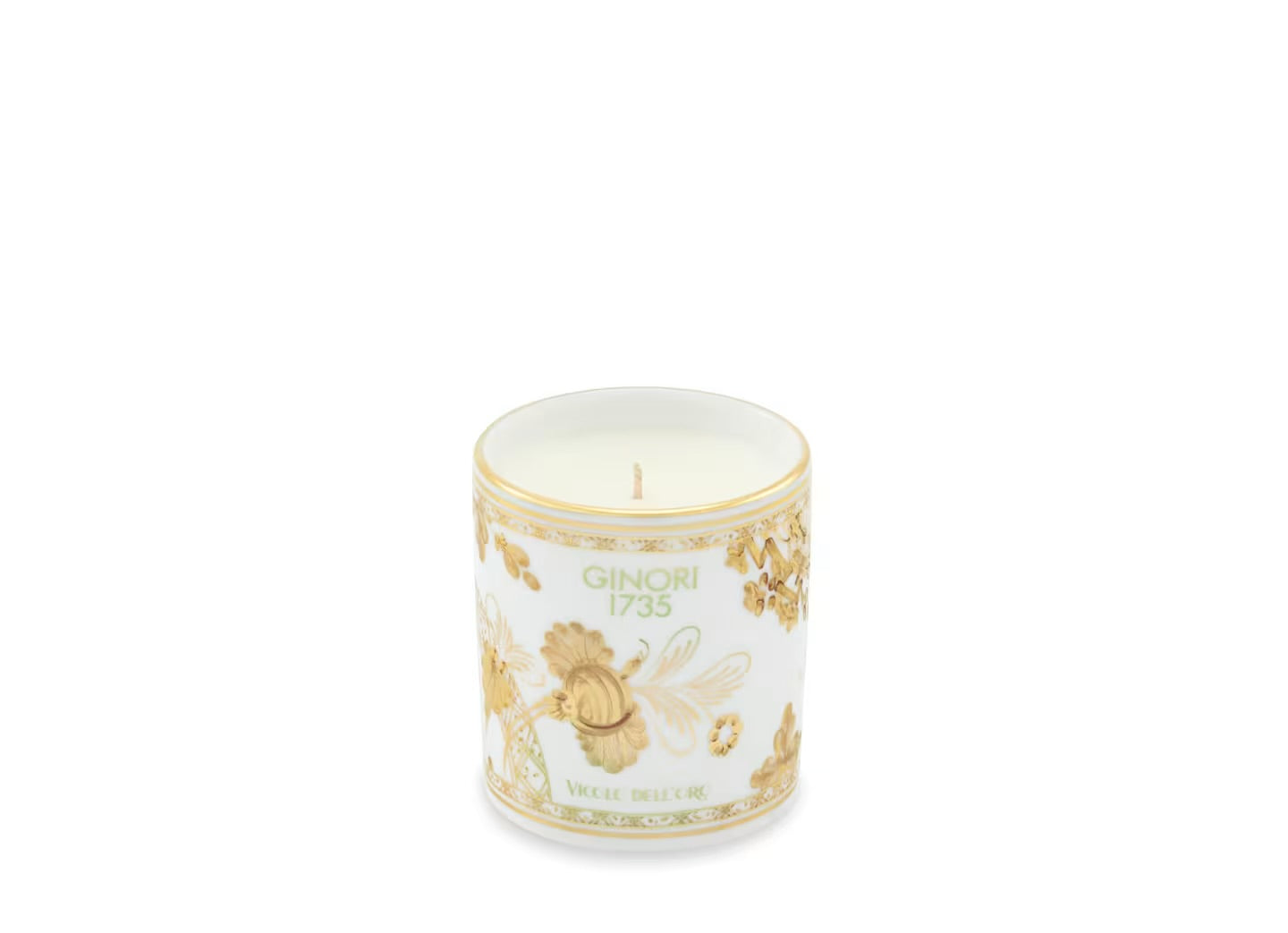 The candle is made of fine white porcelain with a pure gold decoration that defines the classic and distinctive lines of the Ginori 1735 manufacture. The sweet and musky fragrance opens with notes of Bergamot and Green Mandarin, and then reveals a heart of Peony and Boxwood delicately hinted that stands out on the fresh musk, in a refined and unique union. The fragrance Vicolo Dell'Oro will inebriate refined environments and completes the proposal of diffusers for environments and fragrances Oriente Italiano Gold Collection, a collection by Ginori 1735 in the assortment of tableware, tea and coffee, and furnishing accessories.