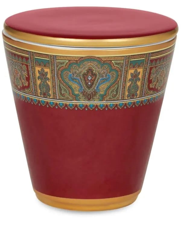Rounded porcelain candle holder with lid, embellished with the iconic Paisley motif around the edge.